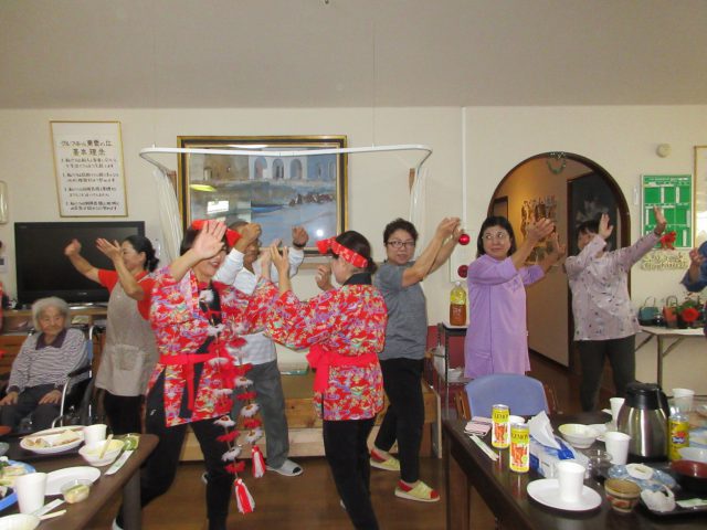 入居者、家族、職員が一堂に会して、今年を振り返りいろいろな出来事や各々の話題で盛り上がりました。 しののめ三味線クラブ、琉舞クラブの余興に、入居者・家族・職員も加わり、歌あり、踊りあり、プレゼントあり、クリスマス・忘年会を楽しく過ごしました。 (令和元年12月22日 GH1号館/石川貴美子発信)