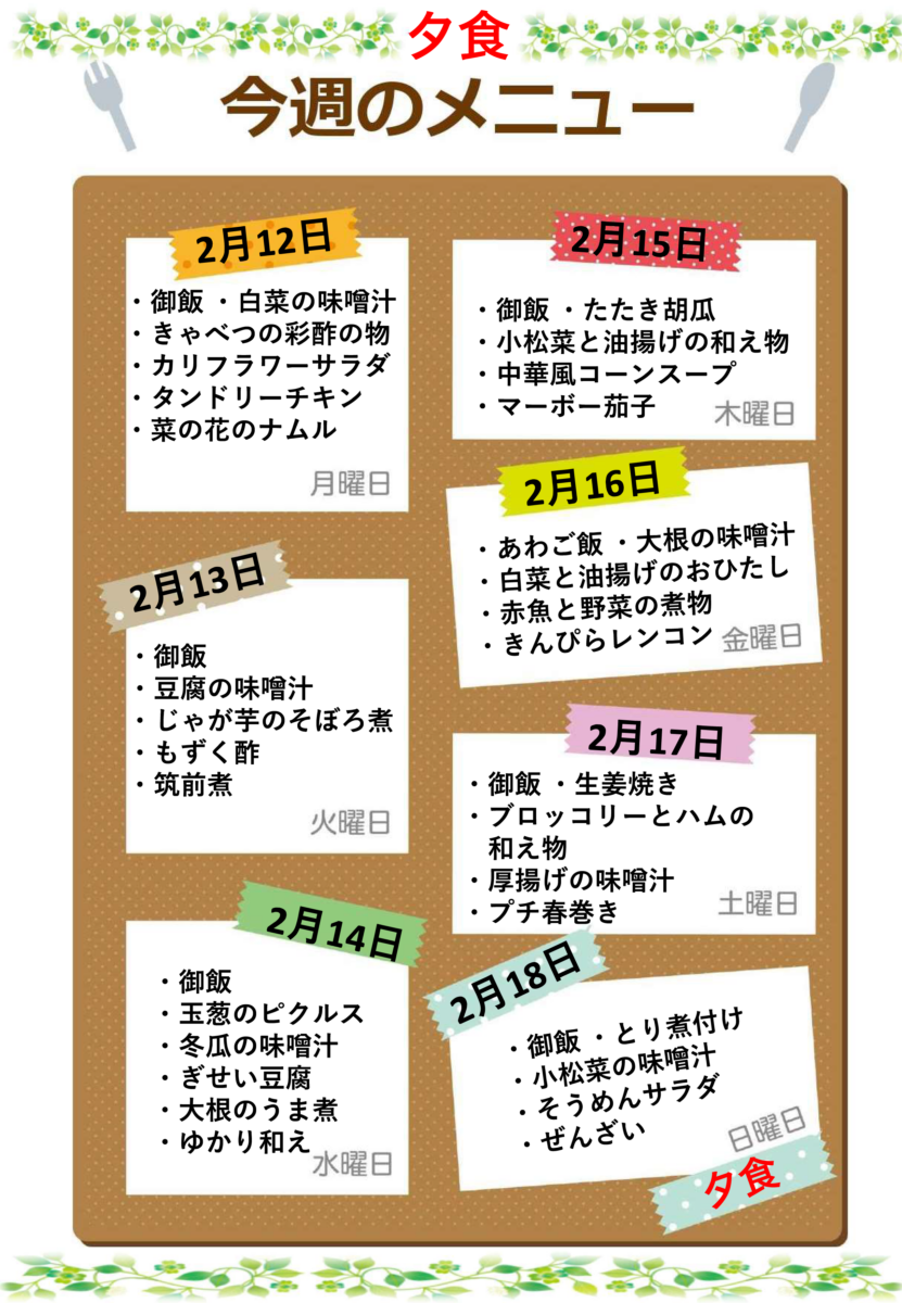 配食サービス2/12(月)~2/18(日)までのメニューです。