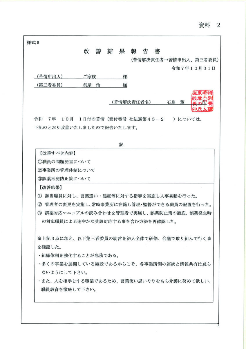 令和7年10月1日受付の住宅型有料老人ホームNEWマチュピチュ及び東雲の丘小規模多機能型居宅介護事業所あて苦情申請について以下の通り改善した事をご報告いたします。