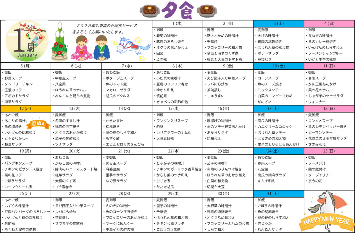 配食サービス1月月間メニューです。