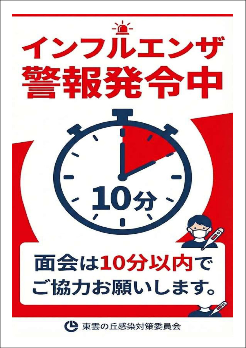 つきましては入居者の感染予防のため、本日から警報解除まで面会を10分以内に制限いたします。なお、面会時はマスクの着用を必須とさせていただきます。
