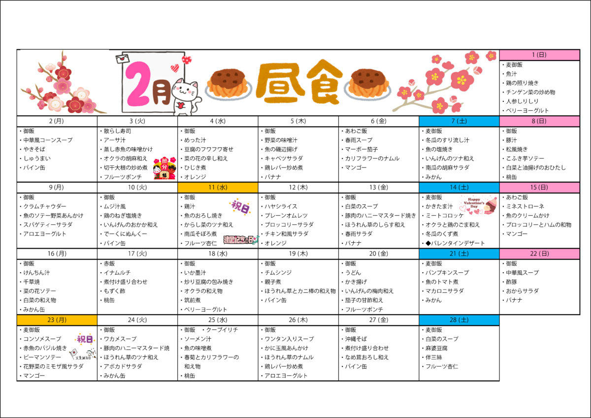 配食サービス2月月間メニューです。